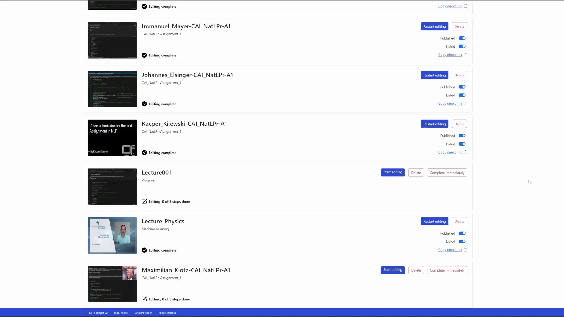 Das System hat die Zusammenfassung, das Transkript sowie alle anderen Daten erstellt. Du kannst (und solltest!) sie überprüfen, indem du auf den Button „Bearbeitung starten“ klickst – dadurch wird dir der generierte Inhalt Schritt für Schritt zur Durchsicht und Bearbeitung angezeigt. Nachdem du fertig bist, siehst du in derselben Liste zwei Schalter – „veröffentlicht“ und „gelistet“. Um das Video mit den Studierenden zu teilen, solltest du in der Regel einfach beide aktivieren – danach können die Studierenden nach deinen Videos suchen und sie in allen relevanten Bereichen finden.