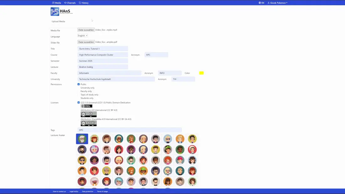 Hier können Sie die Aufzeichnung Ihrer Vorlesung und Ihre Folien hochladen sowie alle relevanten Informationen ausfüllen.
